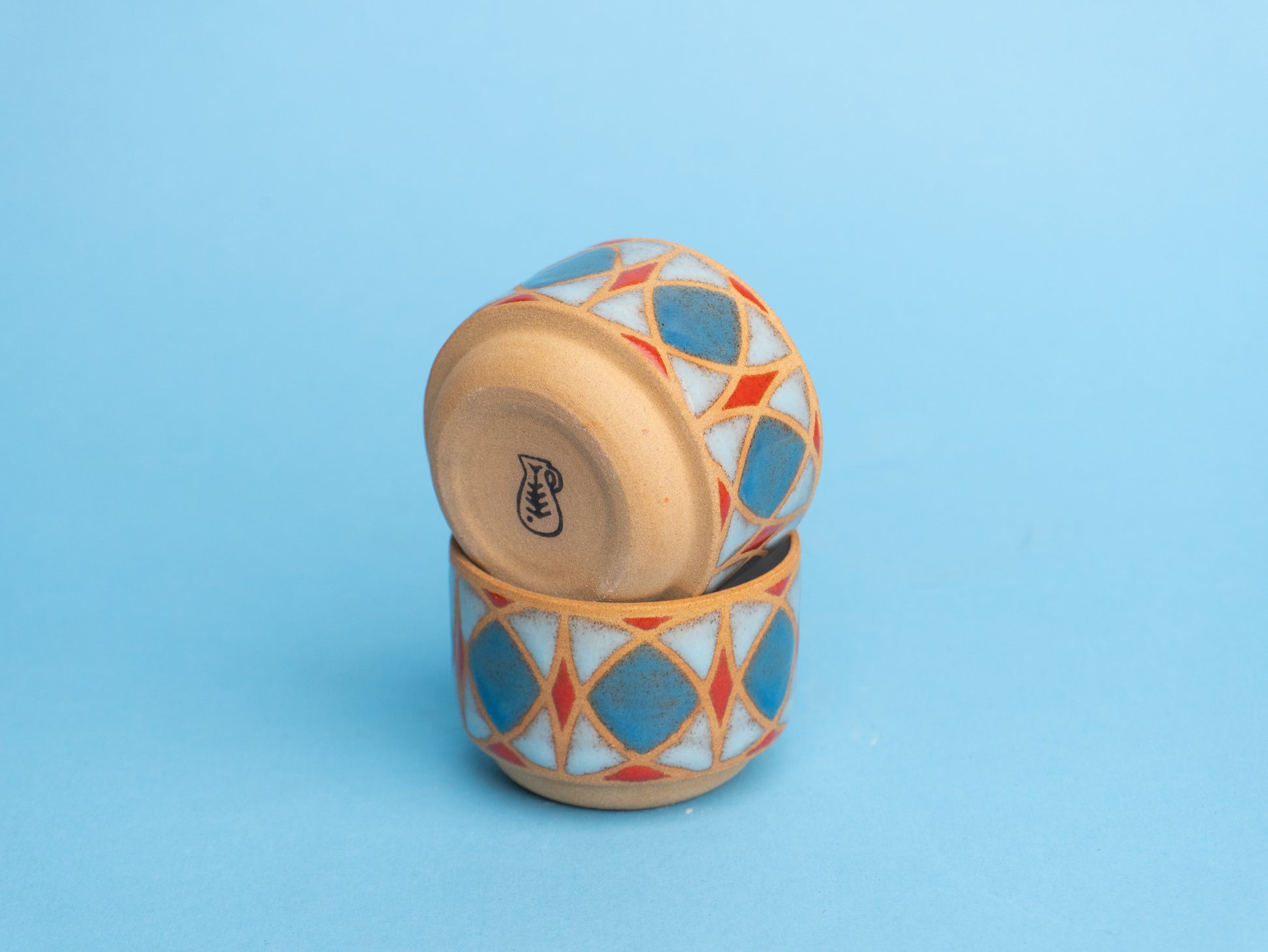 Stoneware espresso cup with a raw clay exterior and glossy patterned glaze. The interior is fully glazed for easy cleaning.