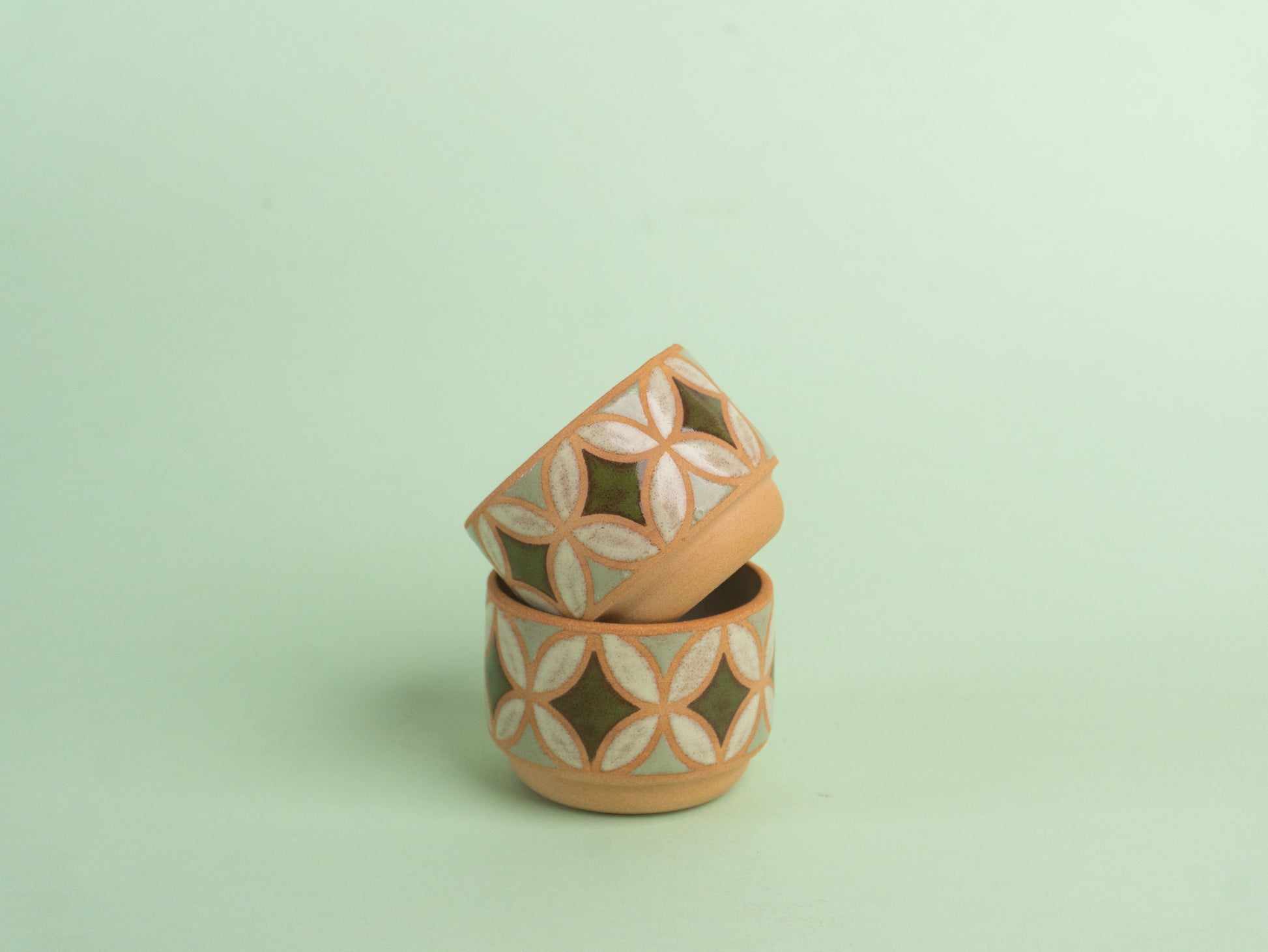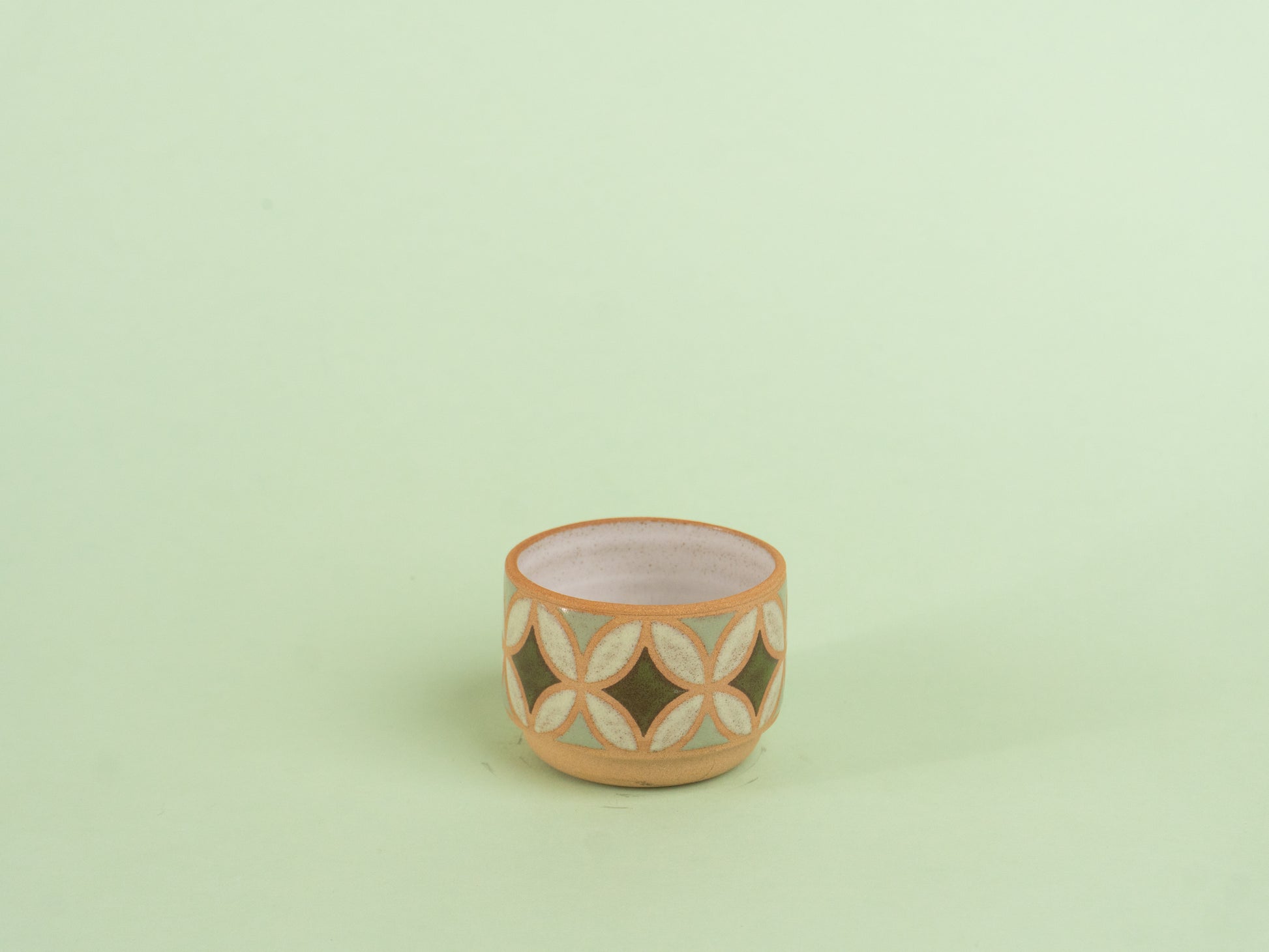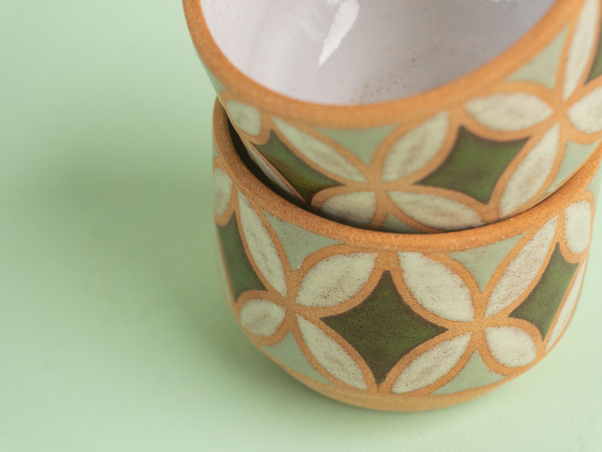 Stoneware mug wheel-thrown and hand-painted, with a raw clay exterior and glossy patterned glaze. The inside is fully glazed for easy cleaning.