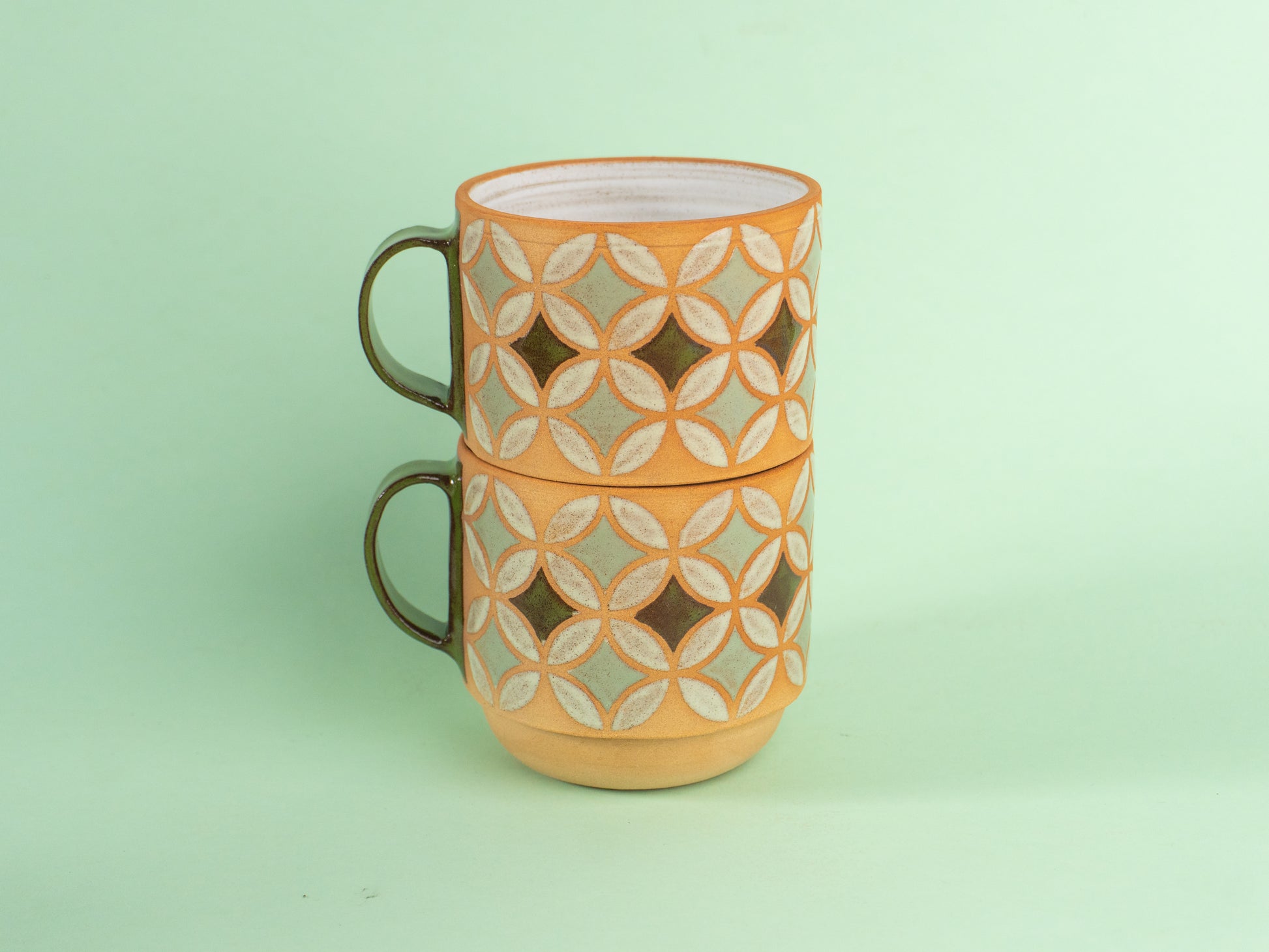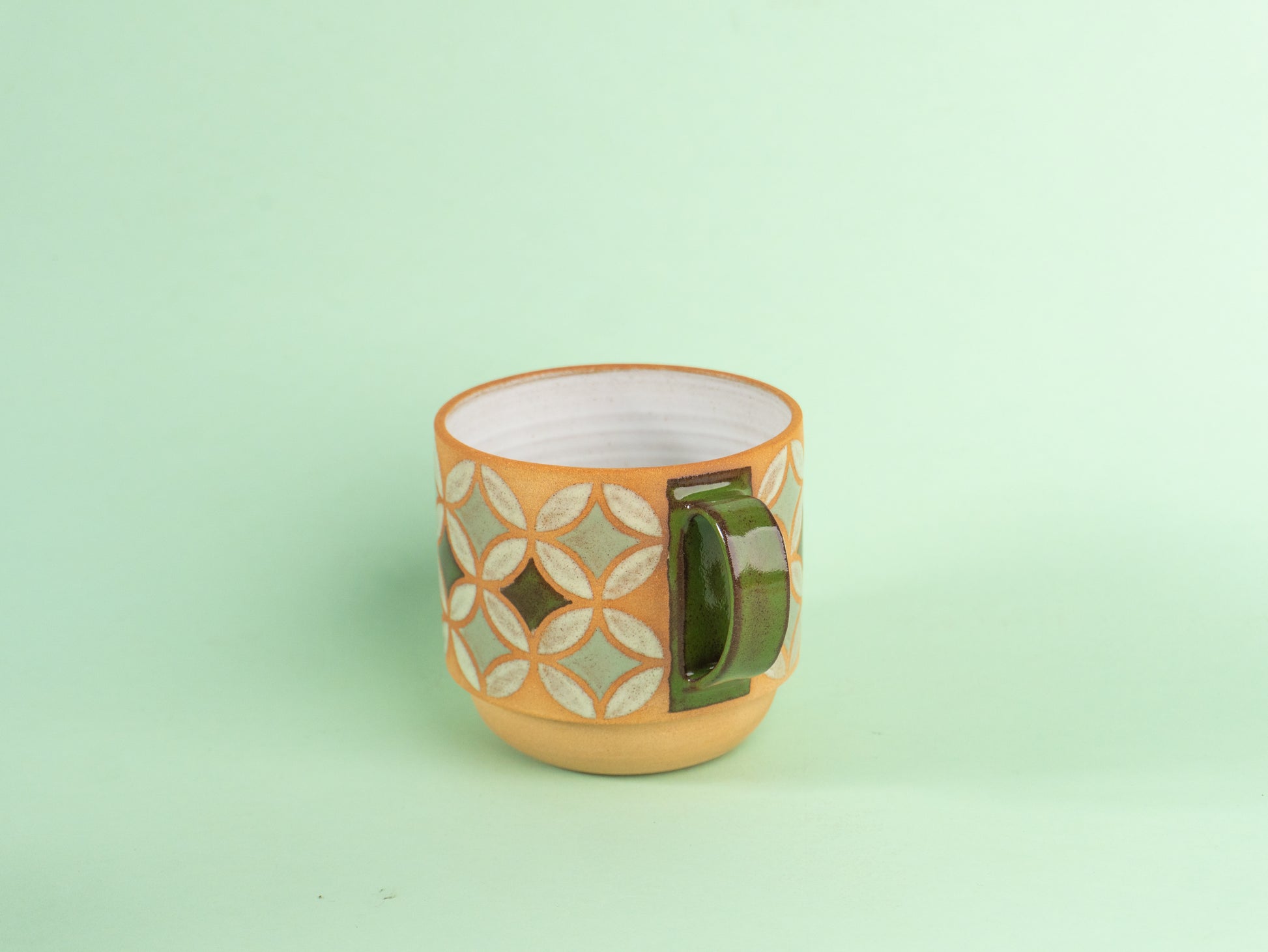 Stoneware mug wheel-thrown and hand-painted, with a raw clay exterior and glossy patterned glaze. The inside is fully glazed for easy cleaning.