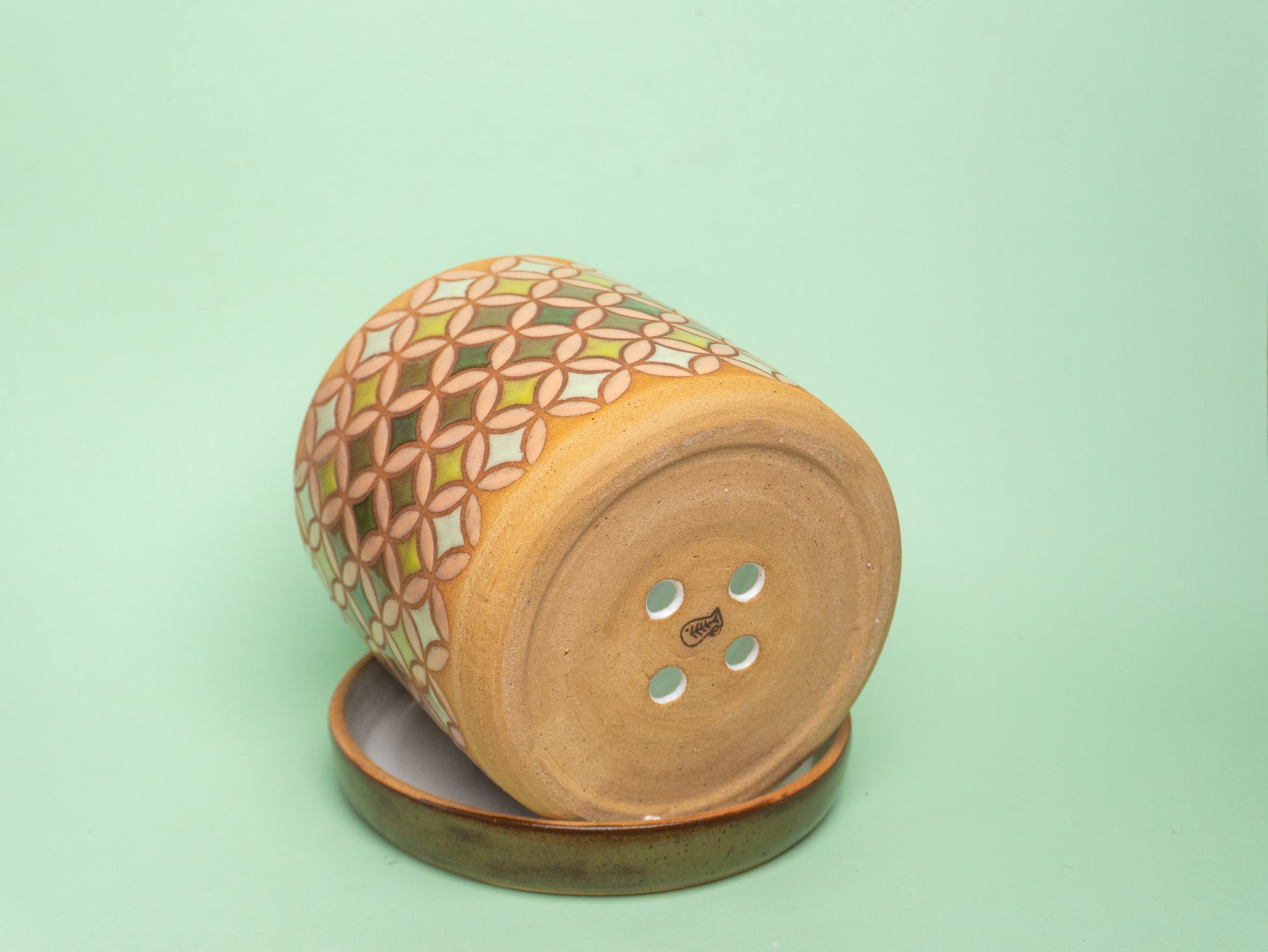 Wheel-thrown and hand-painted stoneware plant pot with raw clay exterior and a glossy patterned glaze. The interior is fully glazed, making it suitable for indoor plants and easy to clean.