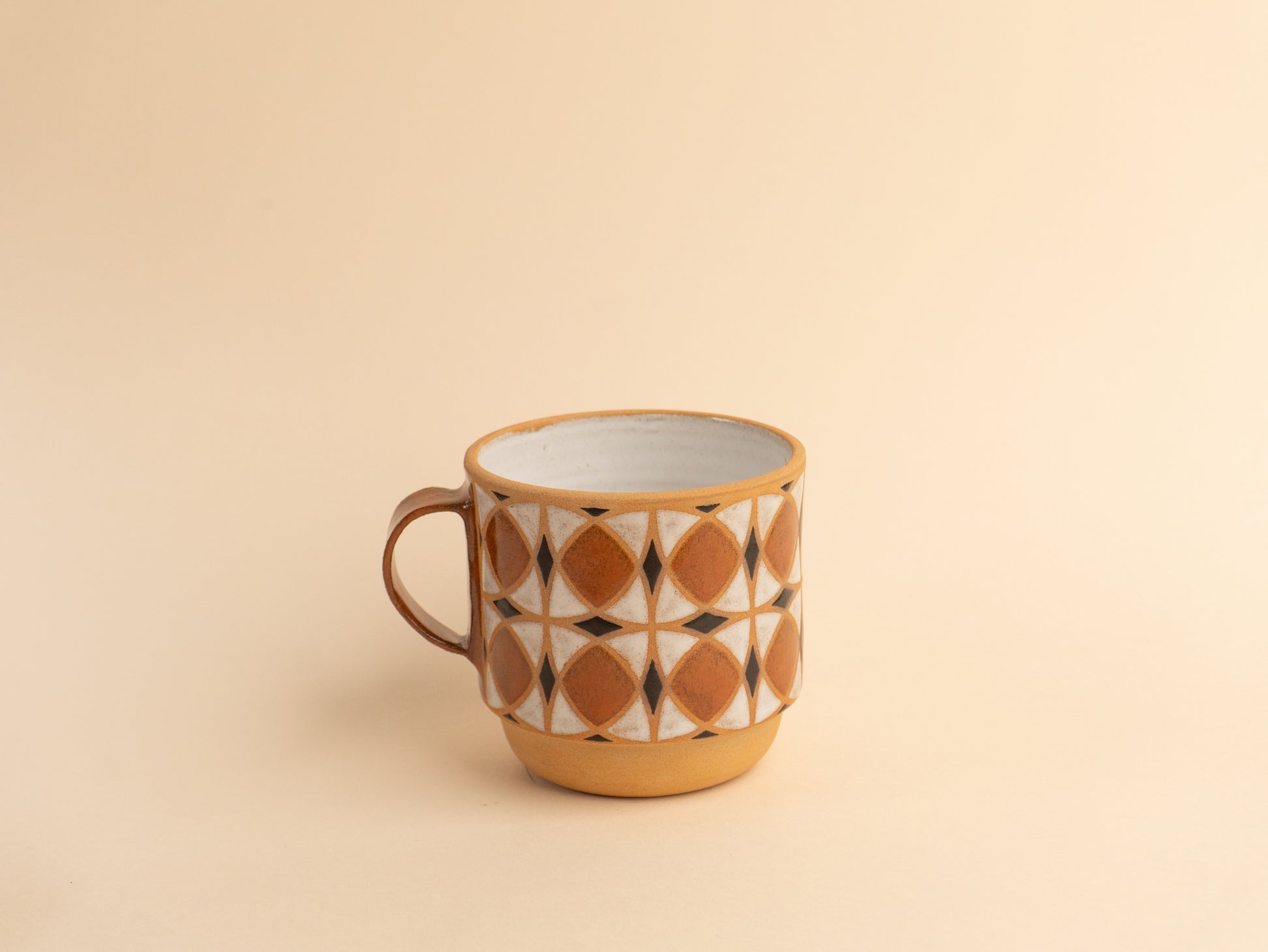 Stoneware mug wheel-thrown and hand-painted, with a raw clay exterior and glossy patterned glaze. The inside is fully glazed for easy cleaning.