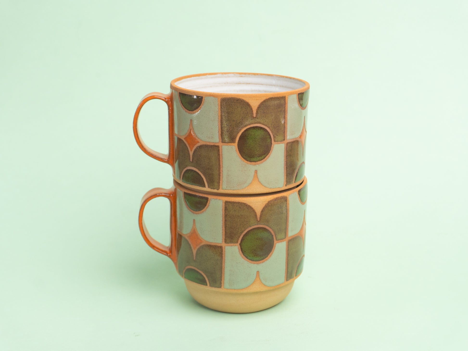 Stoneware mug wheel-thrown and hand-painted, with a raw clay exterior and glossy patterned glaze. The inside is fully glazed for easy cleaning.