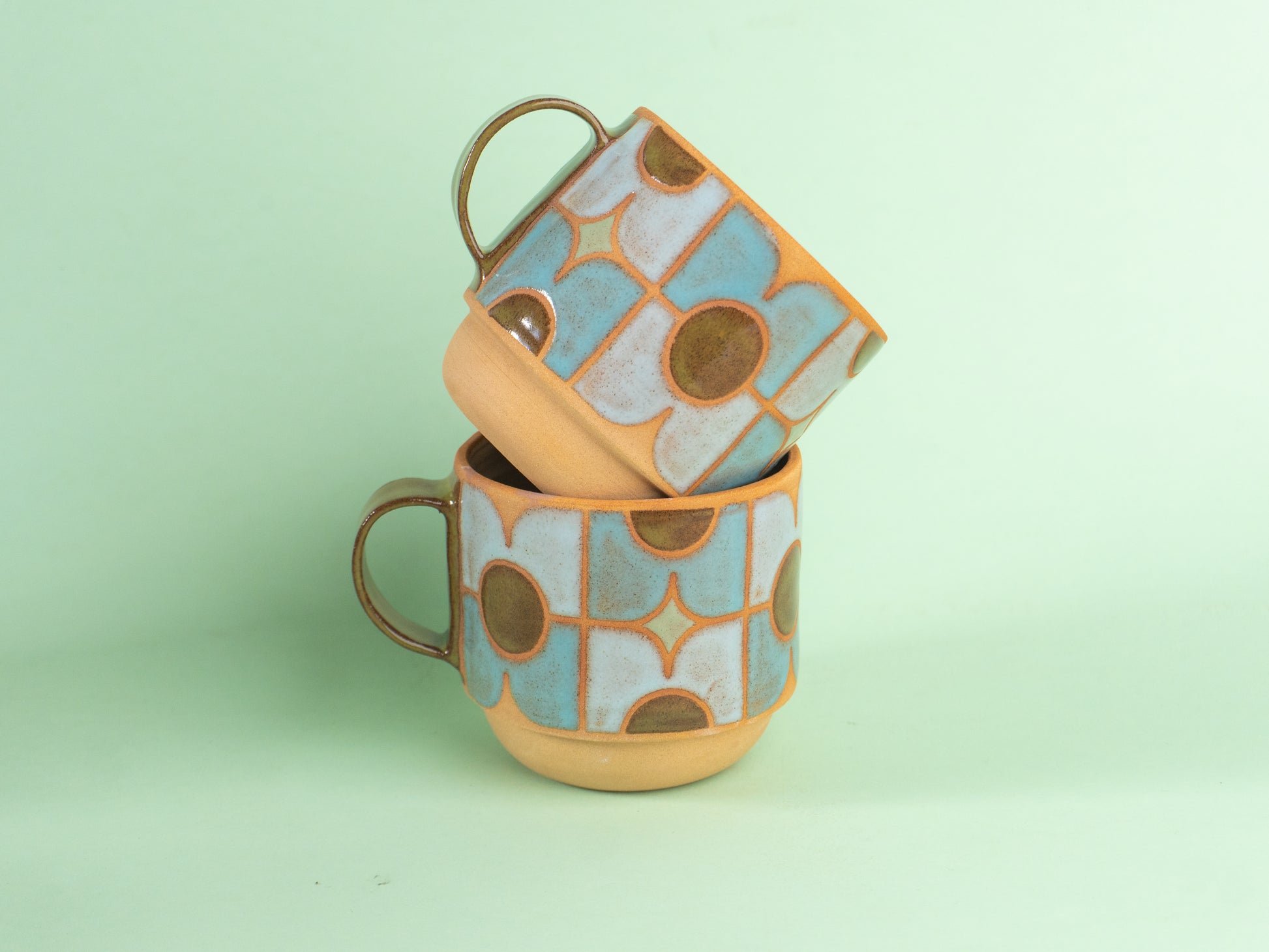 Stoneware mug wheel-thrown and hand-painted, with a raw clay exterior and glossy patterned glaze. The inside is fully glazed for easy cleaning.