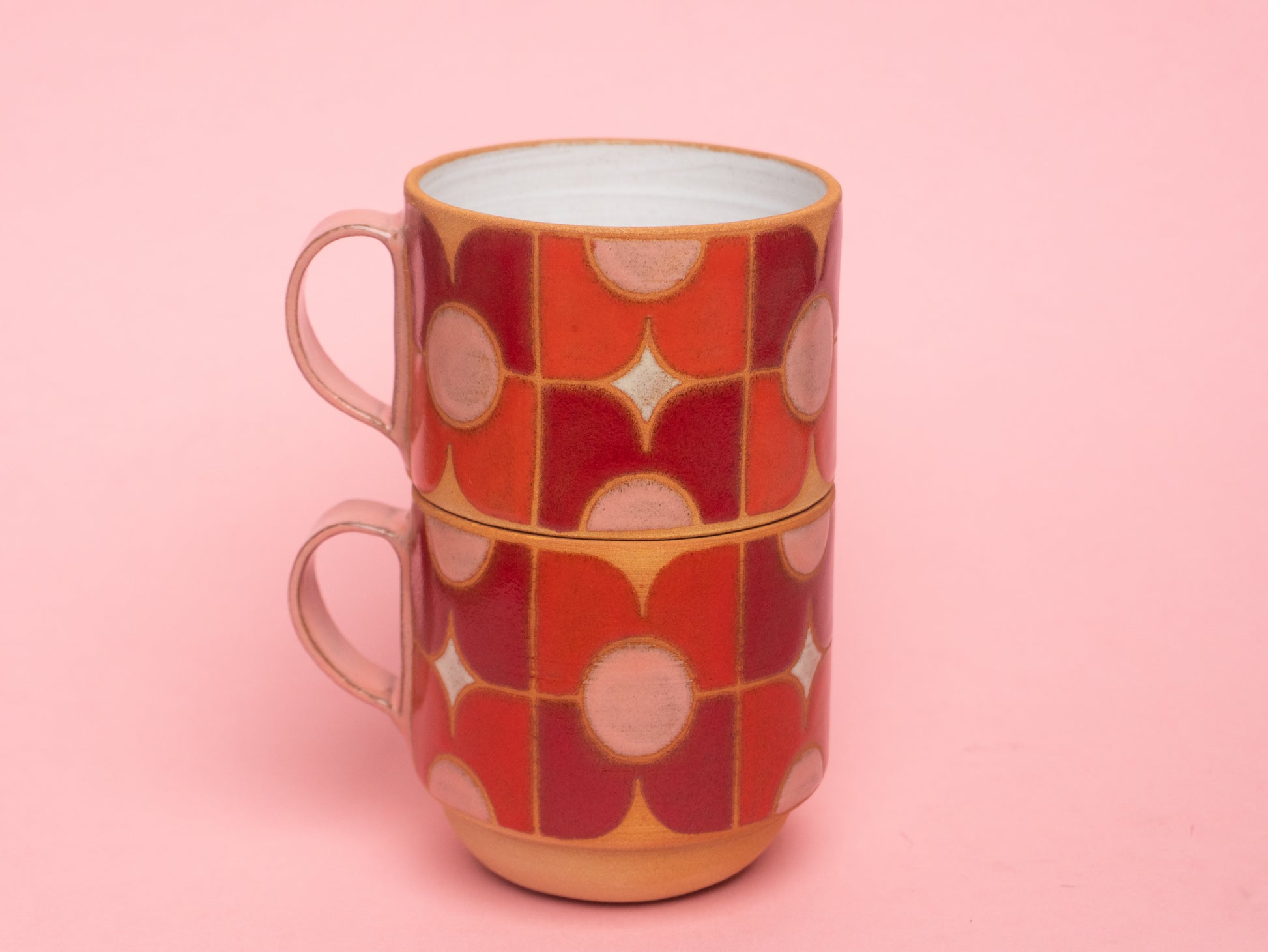 Stoneware mug wheel-thrown and hand-painted, with a raw clay exterior and glossy patterned glaze. The inside is fully glazed for easy cleaning.