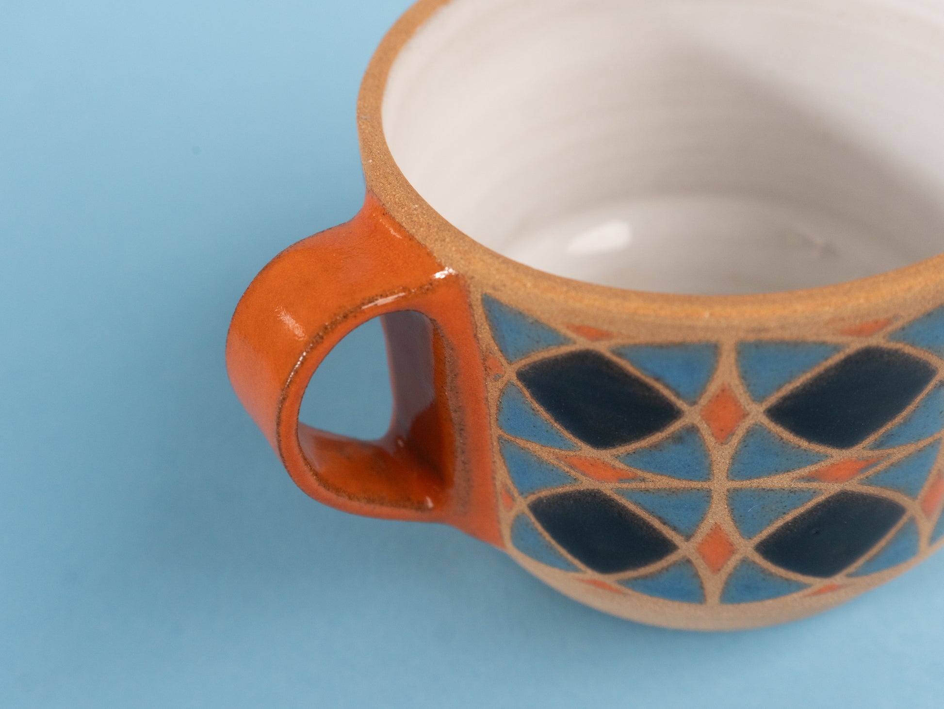 Stoneware americano wheel-thrown and hand-painted, with a raw clay exterior and glossy patterned glaze. The inside is fully glazed for easy cleaning.