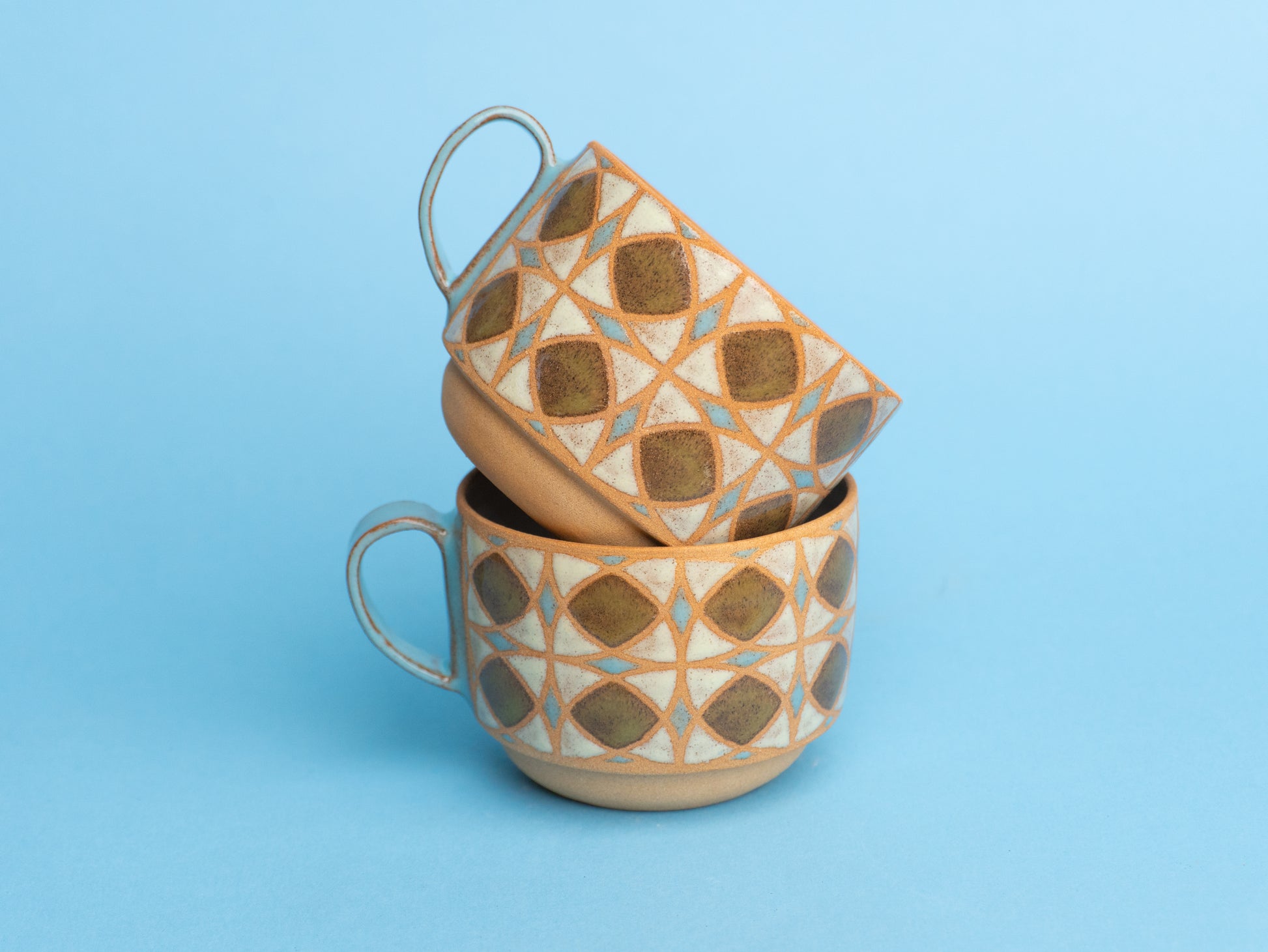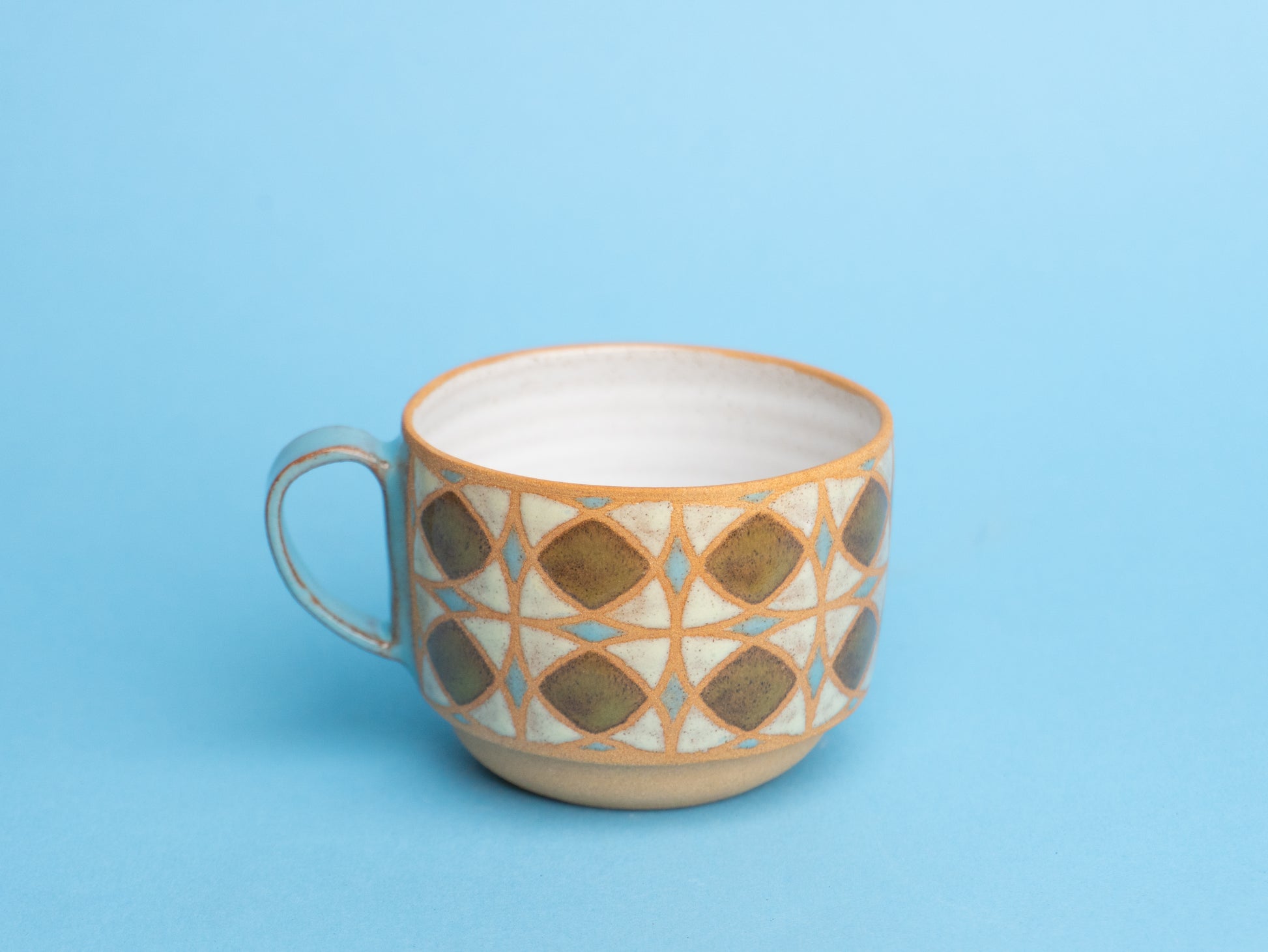 Stoneware americano wheel-thrown and hand-painted, with a raw clay exterior and glossy patterned glaze. The inside is fully glazed for easy cleaning.