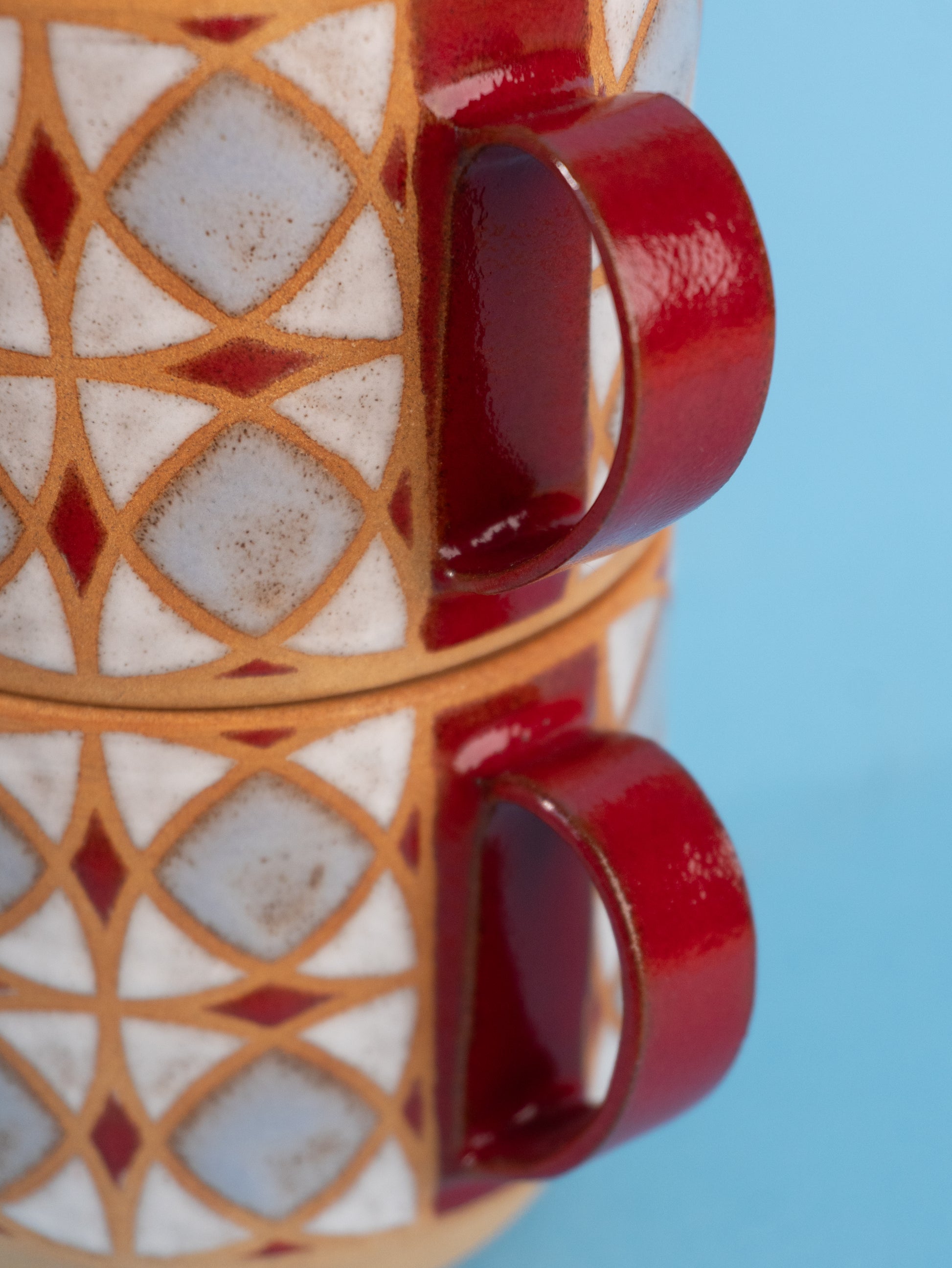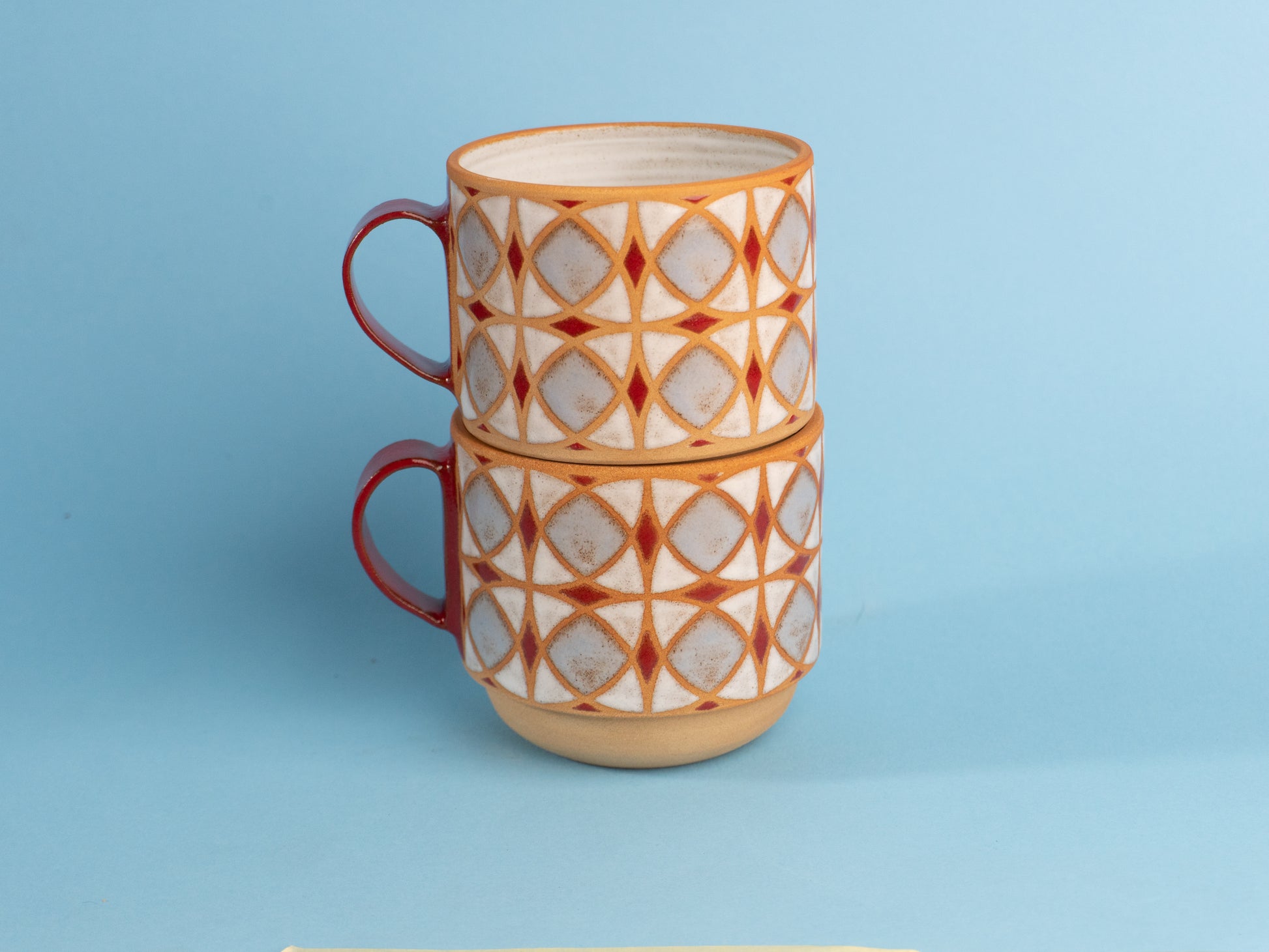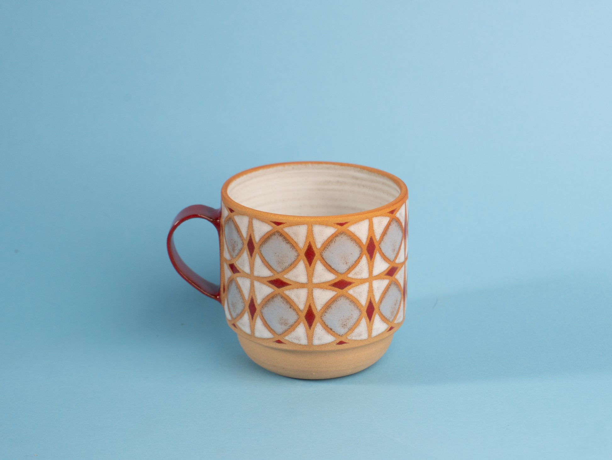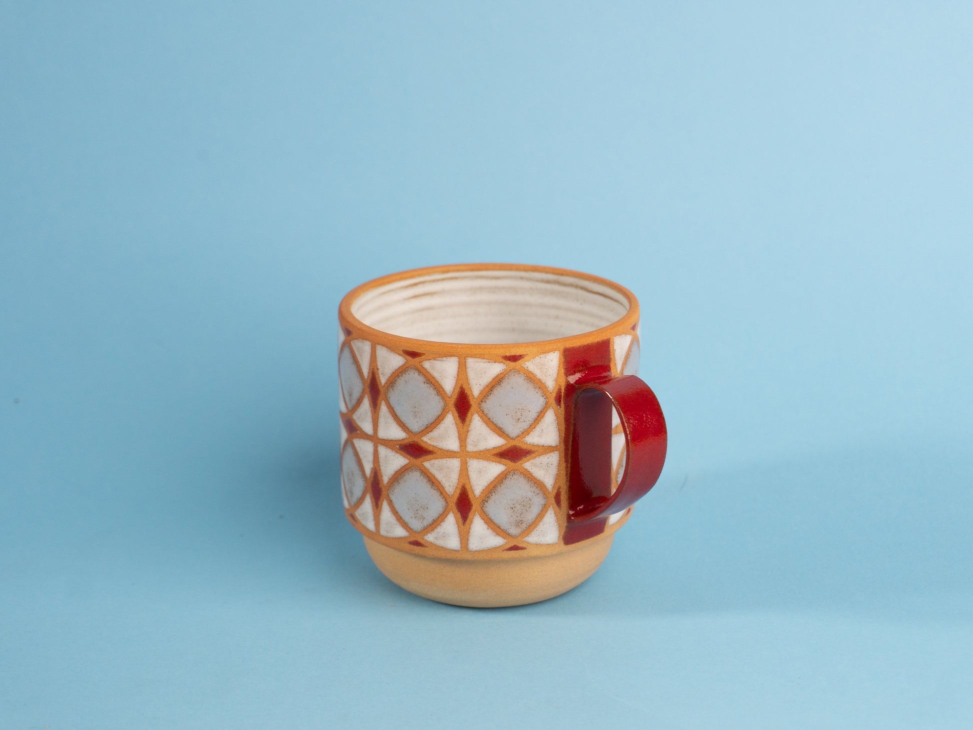 Stoneware mug wheel-thrown and hand-painted, with a raw clay exterior and glossy patterned glaze. The inside is fully glazed for easy cleaning.