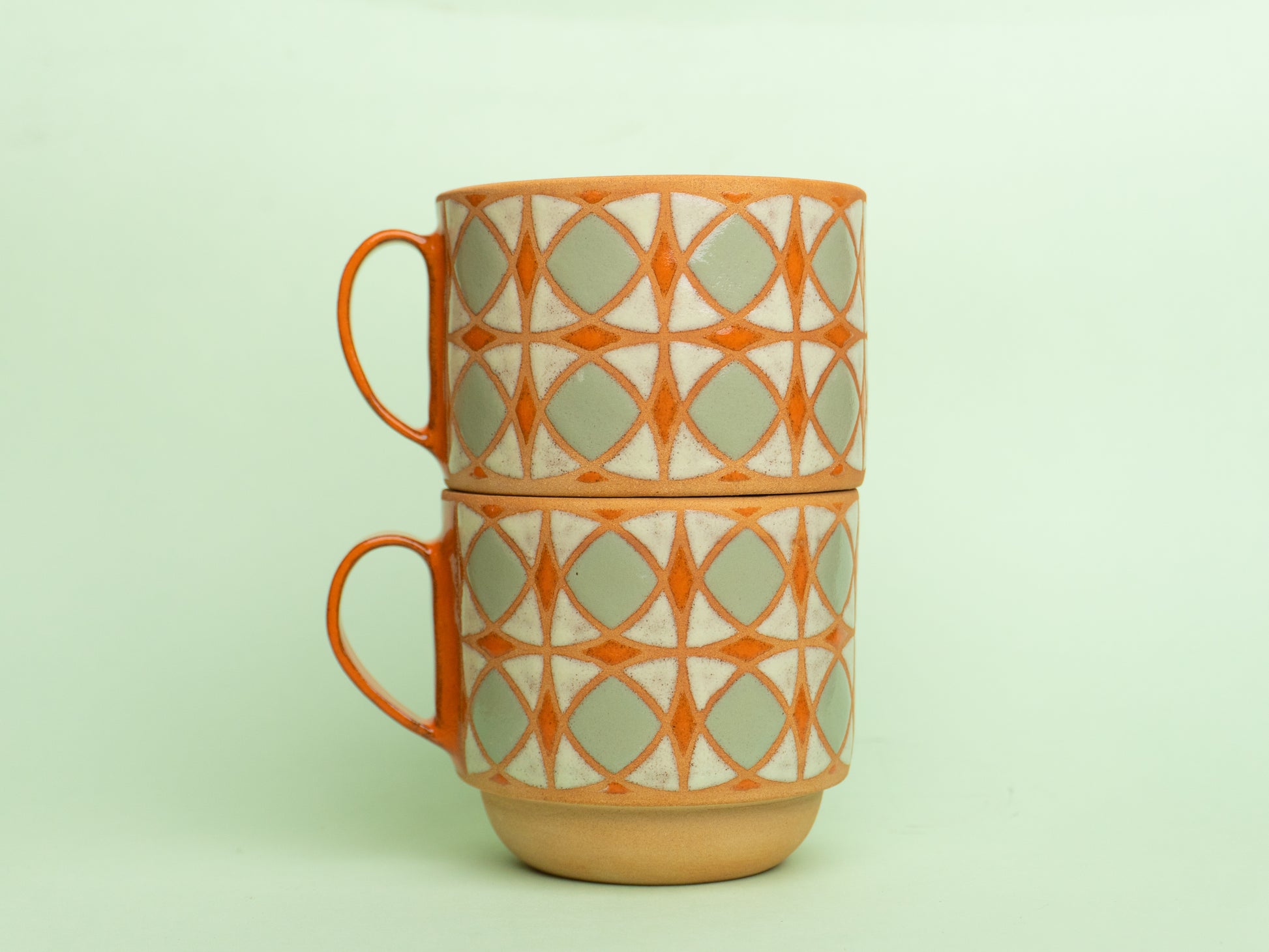Stoneware mug wheel-thrown and hand-painted, with a raw clay exterior and glossy patterned glaze. The inside is fully glazed for easy cleaning.